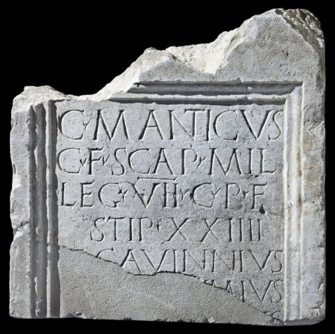 - C(aius) Manticus / C(ai) f(ilius) Scap(tia) mil(es) / leg(ionis) VII C(laudiae) p(iae) f(idelis) / stip(endiorum) XXIIII / C(aius) Avinnius / [Post]umius(?) / [---]s / [---