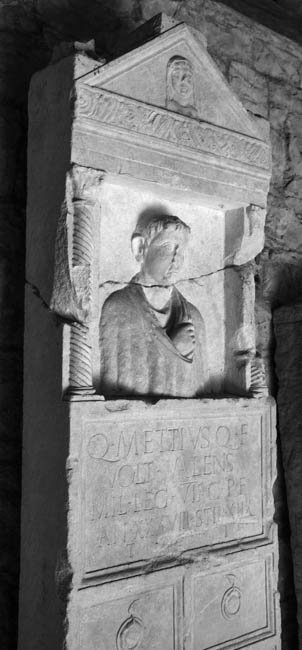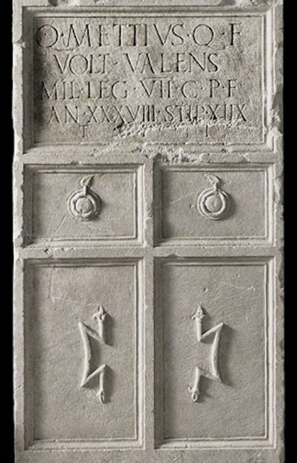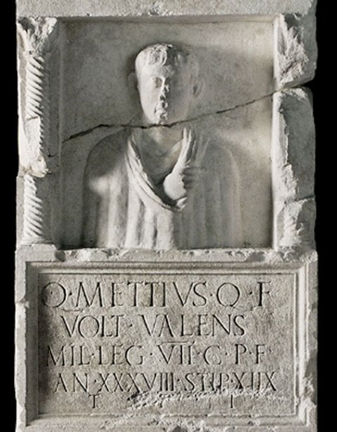 - Q(uintus) Mettius Q(uinti) f(ilius) / Volt(inia) Valens / mil(es) leg(ionis) VII C(laudiae) p(iae) f(idelis) / an(norum) XXXVIII stip(endiorum) XIIX / t(estamento) f(ieri) i(ussit)
