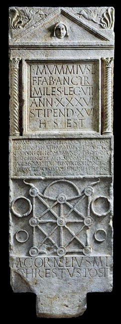 - L(ucius) Mummius L(uci) / f(ilius) Fab(ia) Ancyra / miles leg(ionis) VII / ann(orum) XXXVI / stipend(iorum) XVI / h(ic) s(itus) e(st) // Arma bis octonis felicia qui tulit annis / hic situs est fato Mummius ipse suo / si sapiunt obiti data munera percipis am(pla) / et recipis nostrae pignus amicitiae / hoc tibi cum titulo posuit Cornelius Chrestus / et dixit lachrymans(!) sit tibi ter(r)a levis // M(arcus) Cornelius M(arci) l(ibertus) / Chrestus pos(u)it