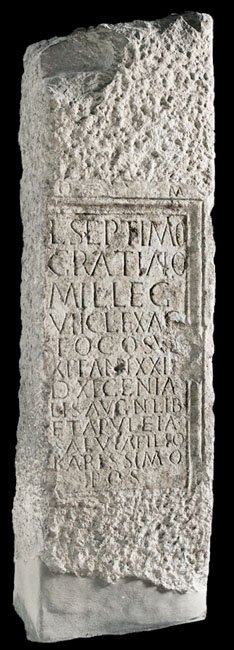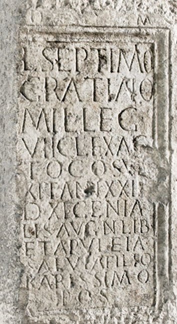 - D(is) M(anibus) // L(ucio) Septimio / Gratiano / mil(iti) leg(ionis) / VII Cl(audiae) exac/to co(n)s(ularis) v[i]/xit ann(os) XXII[II] / d(ies) XI Genia/lis Aug(usti) n(ostri) lib(ertus) / et Apuleia / Salvia filio / karissimo / pos(uerunt)