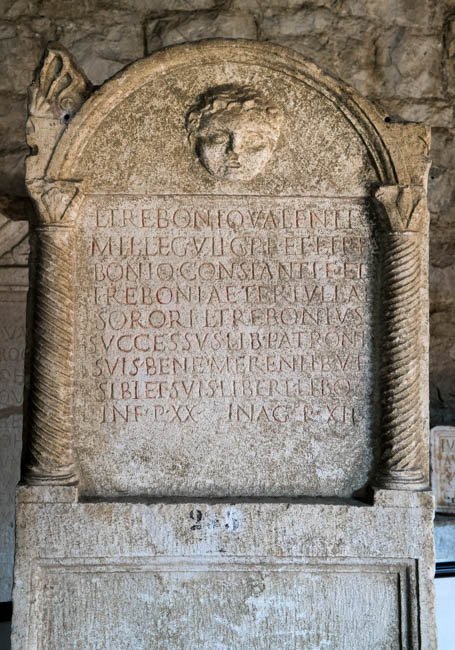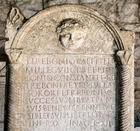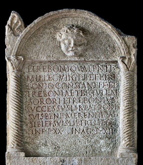 - L(ucio) Trebonio Valenti / mil(iti) leg(ionis) VII C(laudiae) p(iae) f(idelis) et L(ucio) Tre/bonio Constanti f(ilio) et / Treboniae Tertullae / sorori L(ucius) Trebonius / Successus lib(ertus) patronis / suis bene merentib(us) v(ivus) f(ecit) / sibi et suis libert(is) lib(ertabus)q(ue) / in f(ronte) p(edes) XX in ag(ro) p(edes) XII