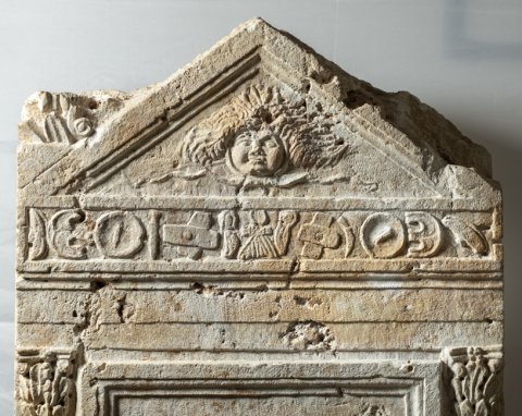 - Giebel mit Grogoneion und Akroteren. Darunter Waffenfries (Schilde, Schwerter, Beinschienen, Panzer). Gerahmtes Schriftfeld zwischen Säulen mit Spiralkannelur. Unter der Inschrift Tür mit vier Kassetten, in den oberen ringförmige Türklopfer mit Blattattaschen, unten Kelche mit Weinranken.