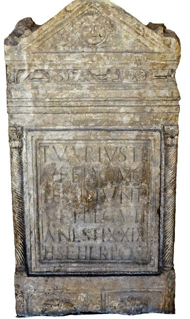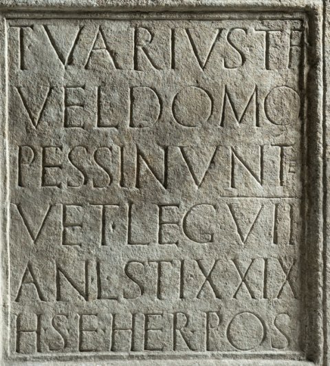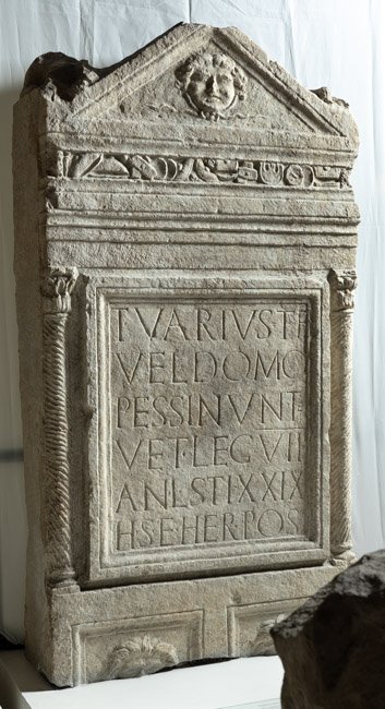 - T(itus) Varius T(iti) f(ilius) / Vel(ina) domo / Pessinunte / vet(eranus) leg(ionis) VII / an(norum) L sti(pendiorum) XXIX / h(ic) s(itus) e(st) her(es) pos(uit)
