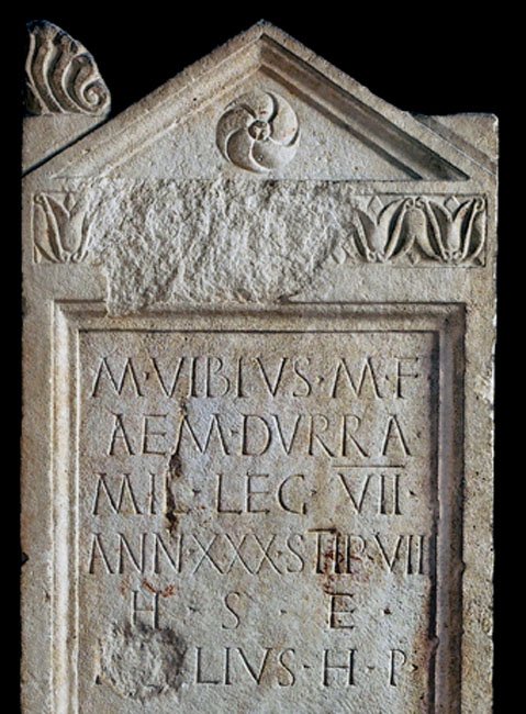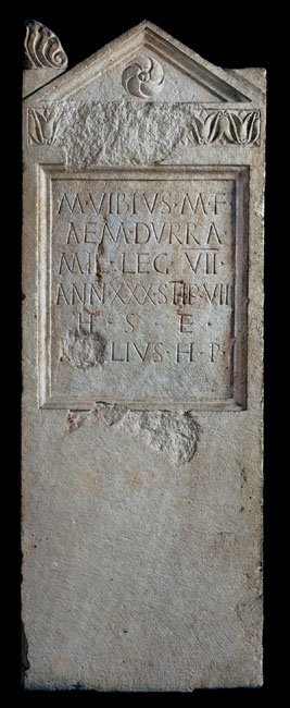 - M(arcus) Vibius M(arci) f(ilius) / Aem(ilia) Durra(chio)(!) / mil(es) leg(ionis) VII / ann(orum) XXX stip(endiorum) VII / h(ic) s(itus) e(st) / [---]lius h(eres) p(osuit)