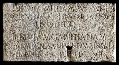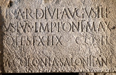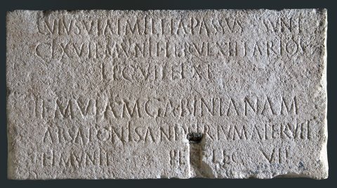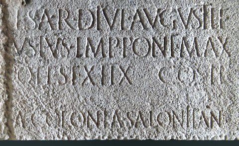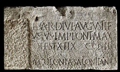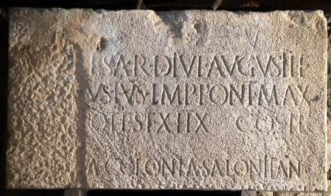 - [Ti(berius) C]aesar divi Augusti f(ilius) / [Aug]ustus Imp(erator) pont(ifex) max(imus) / [trib(unicia)] potest(ate) XIIX co(n)s(ul) II / [viam] a colonia Salonitan(a) / [ad f]in[e]s provinciae Illyrici / [------] / cuius viai(!) millia passus(!) sunt / CLXVII munit per vexillarios / leg(ionum) VII et XI / item viam Gabinianam / ab Salonis Andetrium aperuit / et munit per leg(ionem) VII
