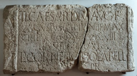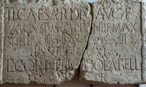 - Ti(berius) Caesar divi Aug(usti) f(ilius) / Augustus imp(erator) pontif(ex) max(imus) / trib(unicia) potest(ate) XX co(n)s(ul) III / leg(io) VII leg(io) XI / P(ublio) Cornelio Dolabella / leg(ato) pr(o) pr(aetore)