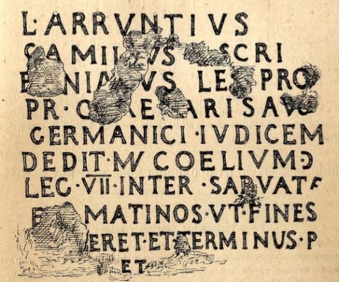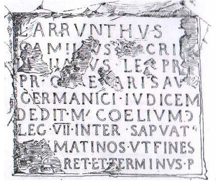 - L(ucius) Arruntius / Cami[ll]us Scri/b[o]nia[n]us le[g(atus)] pro / pr(aetore) C(ai) [C]ae[s]aris Aug(usti) / Germanici iudicem / dedit M(anium) Coelium |(centurionem) / leg(ionis) VII inter Sapuates / e[t La]matinos(?) ut fines / [reg]eret et terminus po[n(eret)]