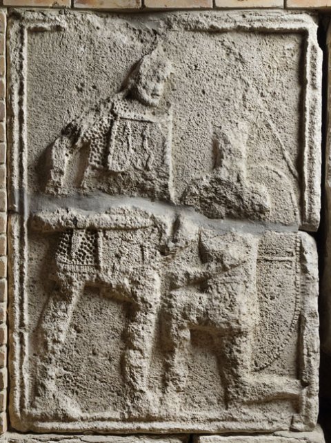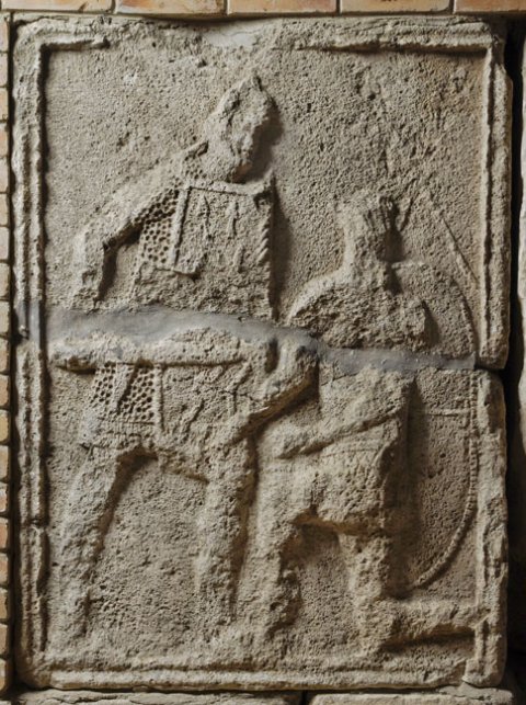 - Römischer Soldat in Helm, Panzerhemd, Schild und Schwert (gladius) im Kampf gegen einen aufs Knie gesunkenen Daker.