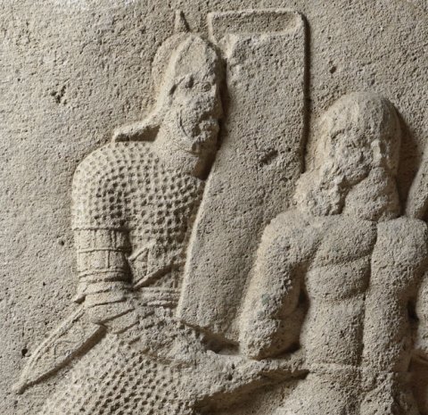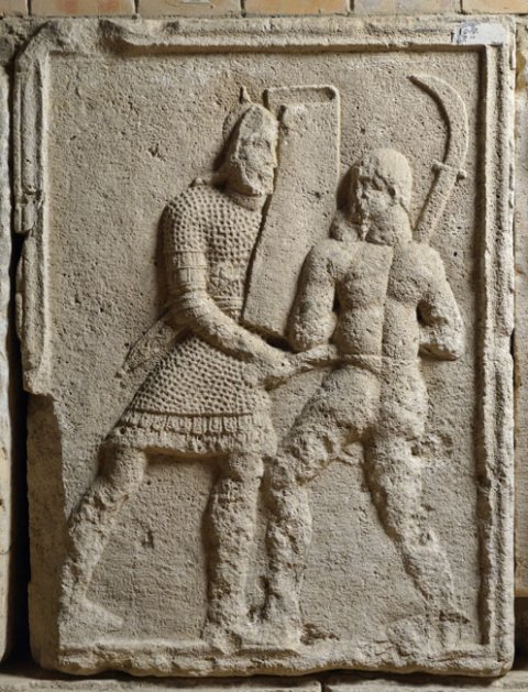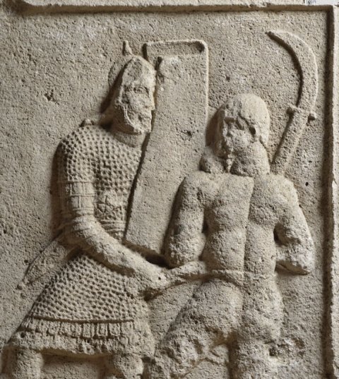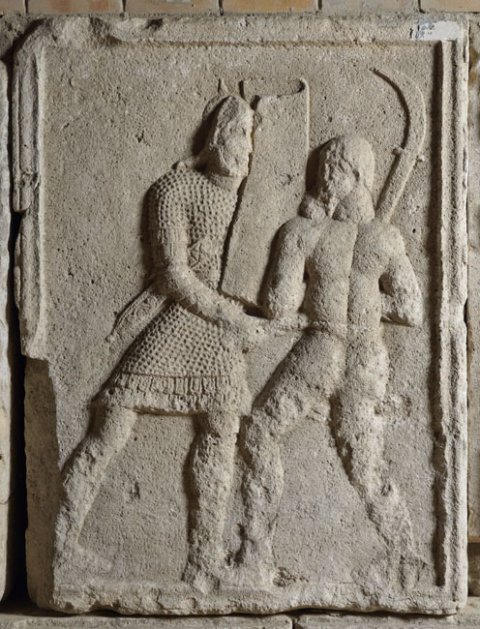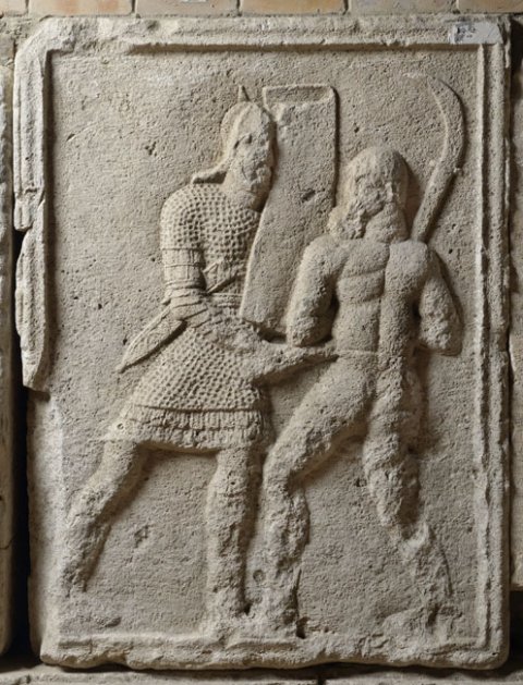 - Römischer Soldat in Helm und Panzerhemd mit erhobenem Schild und Schwertscheide an der rechten Seite stößt sein Schwert (gladius) in den Leib eines bärtigen Dakers in Hosen und mit Sichelschwert.