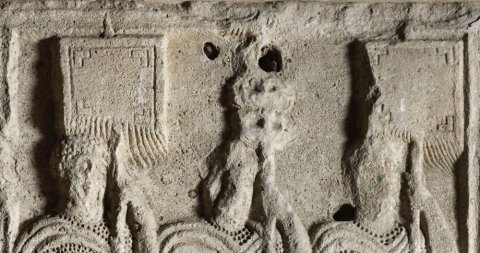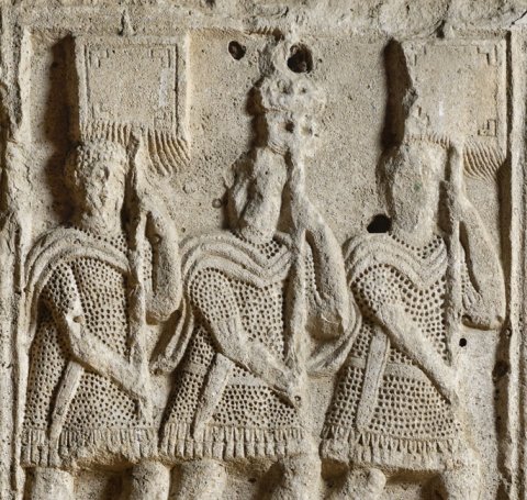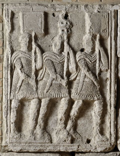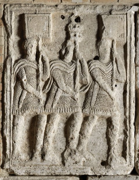 - Drei Standartenträger in Panzerhemd, Mantel und kurzen Hosen, Schwertgurt mit Schwert (gladius) an der rechten Seite. Das signum des mittleren aus drei Kränzen, die anderen tragen eckige Tafeln (vexillum) mit Fransen und Winkelbeschlägen.