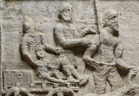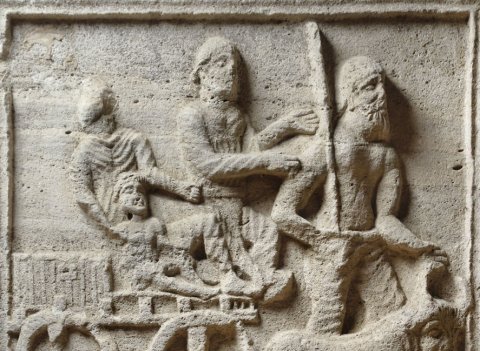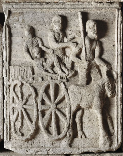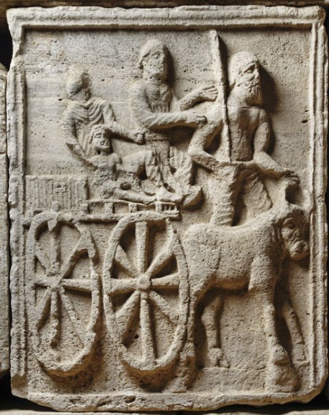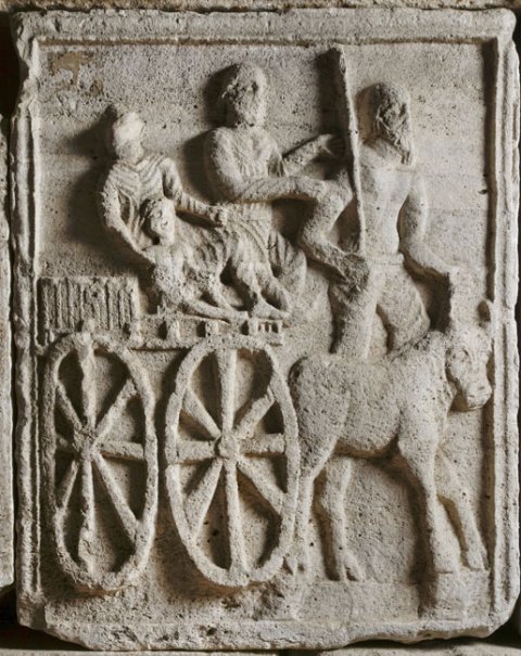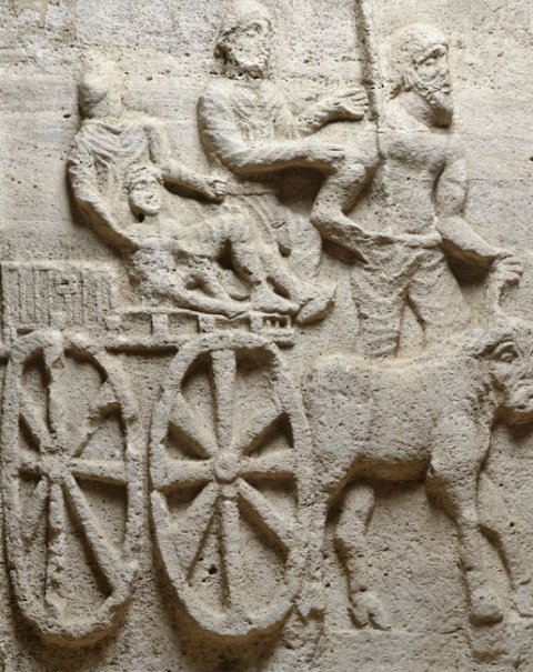 - Wagenszene mit Dakerfamilie. Vierrädriger Ochsenkarren, darauf bärtiger Mann in Ärmelgewand und Hosen, Frau und Kind. Hinter ihnen Truhe. Neben dem Ochsen gehender Mann mit Stock in der Rechten.