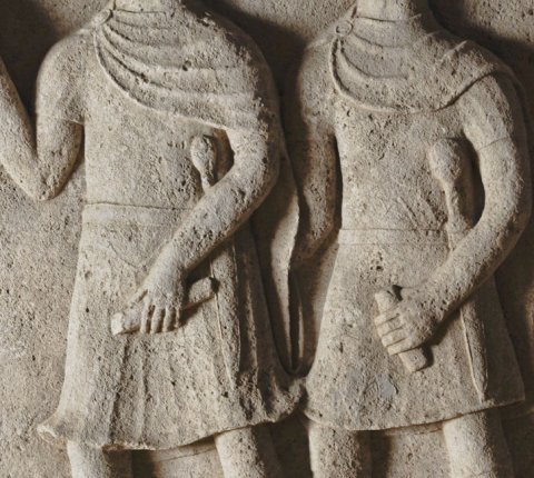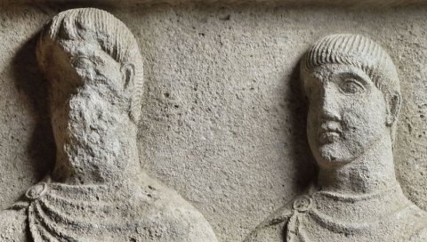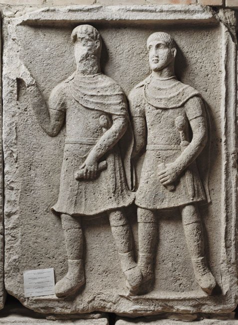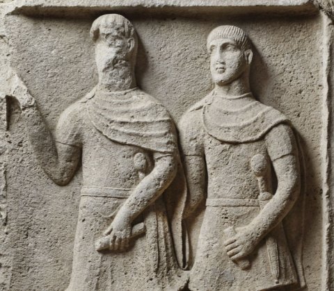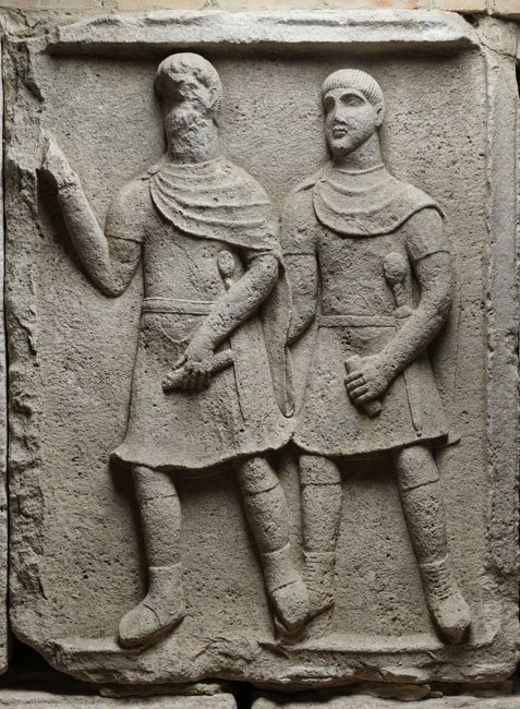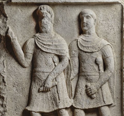 - Historische Person: Kaiser Trajan und ein Begleiter. Beide in kurzer Tunica mit Gürtel und Sagum mit Scheibbenfibel, kurzen Hosen und Schuhen, in der Linken Rolle (volumen). Waffen: an der linken Hüfte Schwert (gladius).