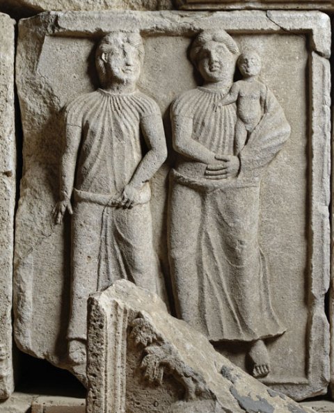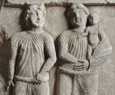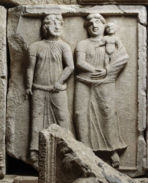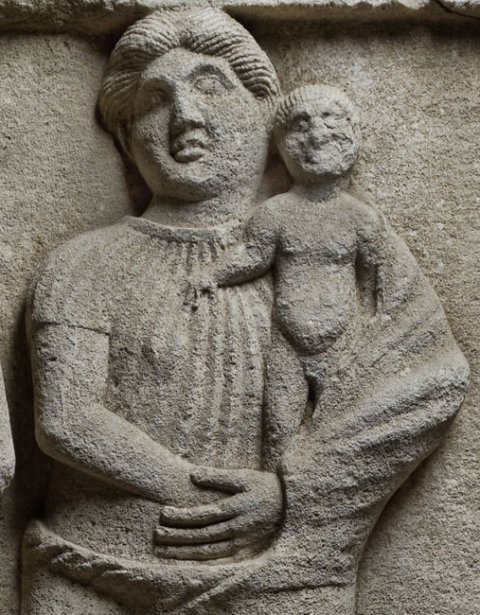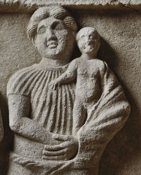 - Zwei dakische Frauen in knöchellangem, kurzärmeligem Gewand, die rechte hält kleines nacktes Kind (Knabe) im Arm, um den ein Tuch gelegt ist.