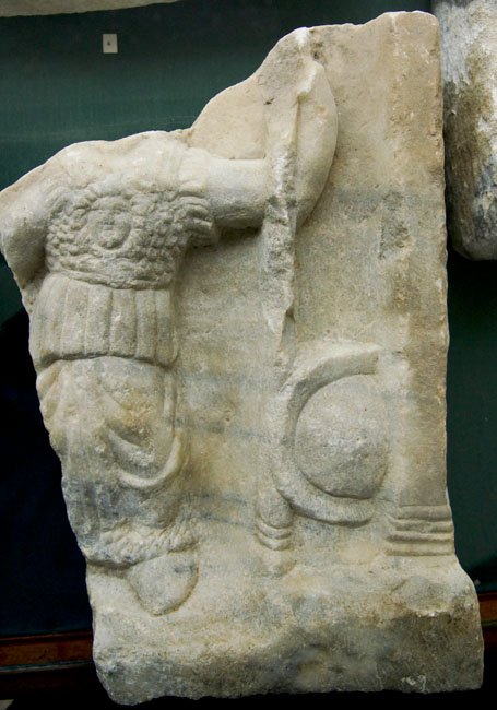 - Mythische Figur: Minerva mit Aegis und Lanze, Schild lehnt an der Wand, rechts glatter Pilaster.