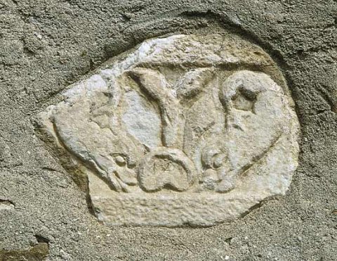 - Muschel und Blattkelch zwischen zwei Delphinen.
