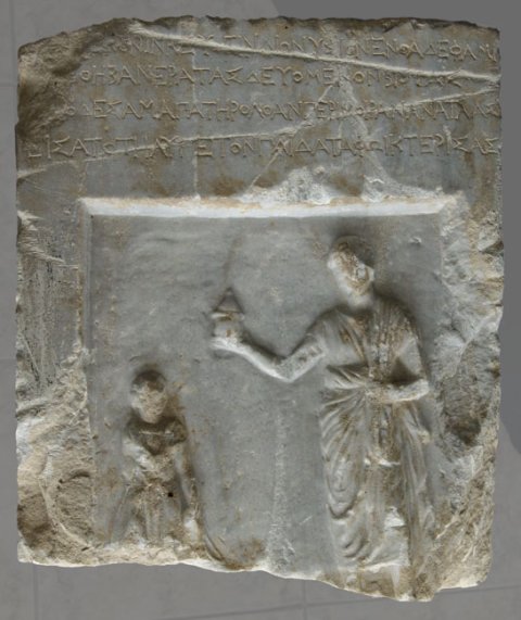 - Stehender Mann im Mantel, der um die Taille zu einem Wulst gedreht ist, in der erhobenen Rechten Pyxis. Vor ihm stehender Knabe.