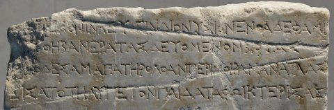 [τάνδε] κόνιν κεύθειν Διονύσιον ἐνθάδε φαμὶ / [πρω]θήβαν ἐρατᾶς δευόμενον βιοτᾶς·/ [οὗ τ]όδε σᾶμα πατὴρ ὀλοὰν περὶ Μοῖραν ἀνατλὰς / εἵσατο· τη αὖτε τὸν παῖδα τάφωι κτερίσας