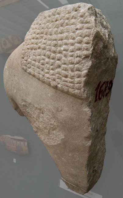 - Fragment eines unterlebensgroßen Kouros: linker Teil des Rückens mit Schulter und auf den Rücken fallendem Haar (Buckellockenfrisur).
