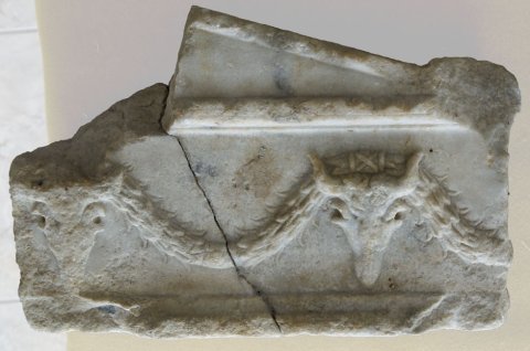- Bukranien, an denen Blattgirlanden hängen. Darüber rechte Ecke eines Giebels.