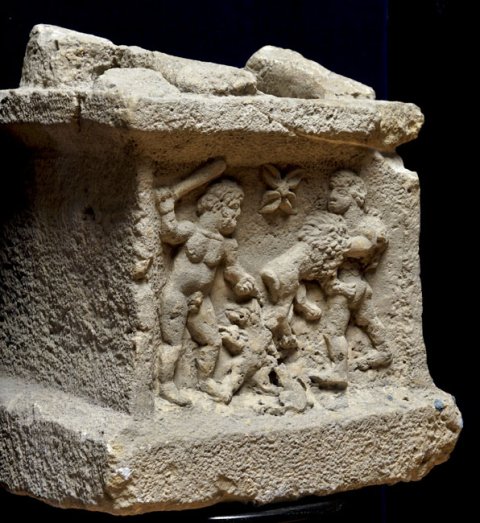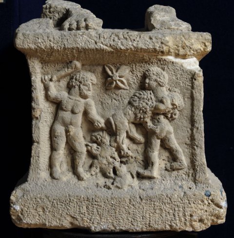 - Mythos: auf der Vorderseite der Basis zwei Taten des Hercules (Herakles). Rechts Kampf mit dem Löwen, links mit Cerberus (Kerberos). Dazwischen Rosette.