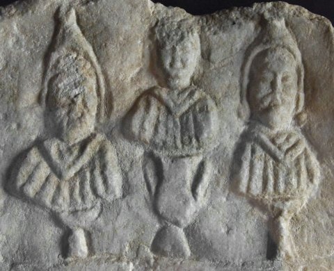 - Mythische Figuren: zwei bärtige Büsten mit Mantel und phrygischer Mütze flankieren eine weibliche bekleidete Büste auf amphorenförmigem Sockel (vgl. Donaureiter).
