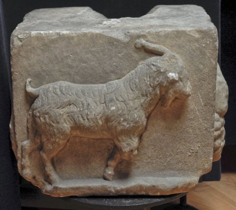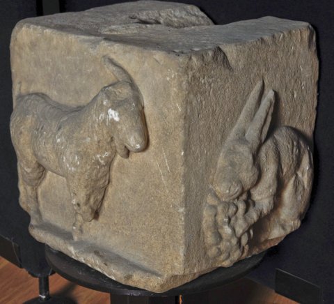 - Tiere: auf der Altarvorderseite Ziegenbock, auf der rechten Seite Hase mit Weintraube, auf der linken Pedum.