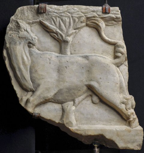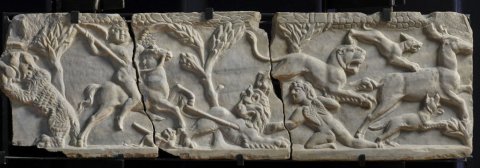 - Mythische Figuren: zwei Eroten auf Löwenjagd, einer zu Pferd, der andere kniend vor dem zusammengebrochenen Löwen. Unter dem Pferd erlegtes Löwenjunges. Nach rechts hin Löwin und zwei Hunde, die einen Hirsch verfolgen.Links vom Reiter Bär, der ein Tier packt. Im Hintergrund Bäume, oberer Rahmen mit Blattdekor. Das vierte Fragment zeigt einen Stier mit zurückgewandtem Kopf, an seinem Schwanz und Hinterbein Raubtierpranken.