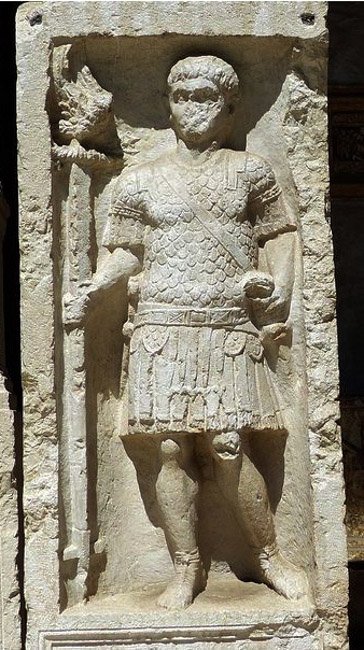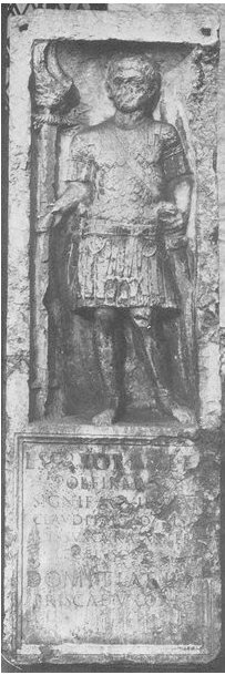 - stehende Ganzfigur eines Soldaten (Offizier - Aquilifer) mit Schuppenpanzer und Sandalen. Waffen: Balteus mit Schwert (gladius), Dolch. In der Rechten Stange mit Adlerfigur.