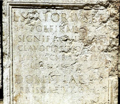 - L(ucius) Sertorius L(uci) f(ilius) / Pob(lilia) Firmus / signif(er) aquil(ifer) leg(ionis) XI / Claud(iae) Piae Fidelis / missus curat(or) veter(anorum) / leg(ionis) eiusdem / Domitiae L(uci) f(iliae) / Priscae uxori