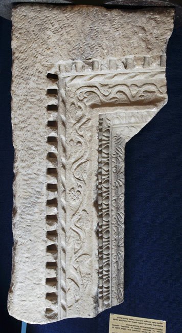 - Zahnschnitt, tordiertes Band, Fries mit Efeuranke, Kyma aus Astragalstab, Eierstab, Palmettenfries
