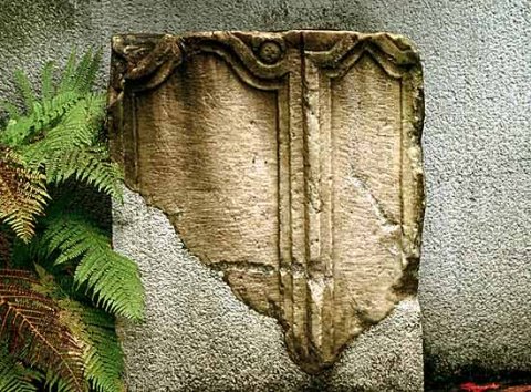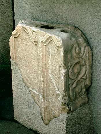 - Eckblock: auf der Vorderseite zwei leere gerahmte Felder, oben Bogen mit Volutenenden bzw. Giebel, auf der rechten Schmalseite Ranke.