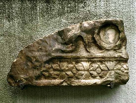 Im Giebelfeld Kranz mit Tänien, darunter Fries mit Blattrosetten.