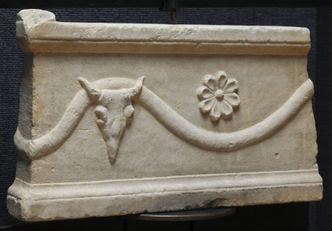 - Bukranienfries mit wulstförmigen Girlanden und Rosetten. Oben und unten profilierter Rahmen, auf der erhaltenen Ecke Rest eines Akroters (?).