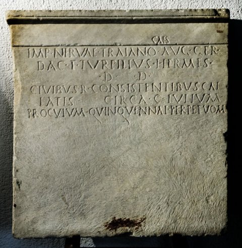 - Imp(eratori) Nervae Traiano Caes(ari) Aug(usto) Ger(manico) / Dac(ico) T(itus) Turpilius Hermes / d(edit) d(edicavit) / civibus R(omanis) consistentibus Cal/latis circa C(aium) Iulium / Proculum quinquennal(em) perpetuom(!)