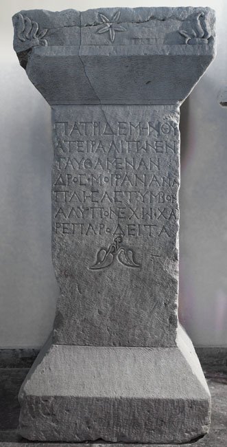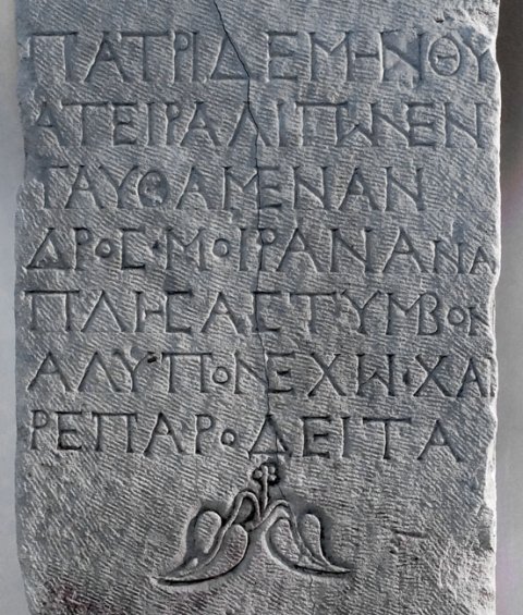 πατρίδ’ ἐμὴν Θυ/άτειρα λιπὼν ἐν/ταῦθα Μέναν/δρος ∙ | μοῖραν ἀνα/πλήσας τύμβον / ἄλυπον ἔχω ∙ | χαῖ/ρε παροδεῖτα.
