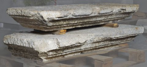 - Zwei Platten mit profilierten Rändern vom Podium des Iseum.