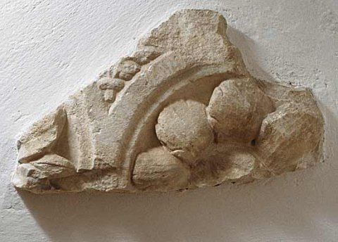 - Kassetteneckenfragment: Kreisfelder mit Rosetten, in den Zwickeln Blattkelche.