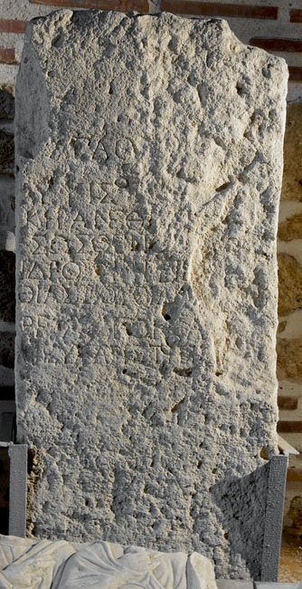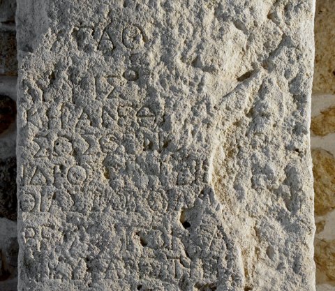 - oben verbr., rechte Hälfte der Inschrift abgeschlagen