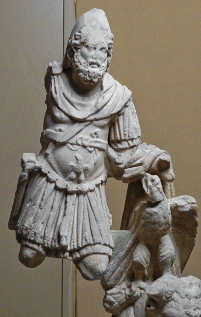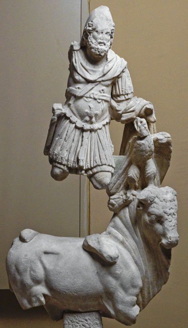 - Mythische Figur: auf dem Stier stehender Jupiter Dolichenus. Auf dem Stierkopf Adler.