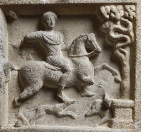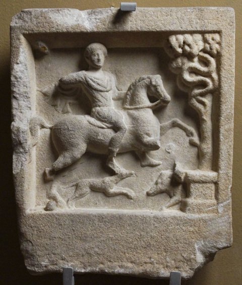 - Mythische Figur: Thrakischer Reiter, unter dem Pferd Hund, vor ihm Alter, dahinter Eber und Baum mit Schlange. Auf dem oberen Rahmen Inschriftreste.