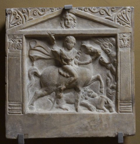 - Mythische Figur: Thrakischer Reiter, unter dem Pferd Löwe über einem Rind. Rechts Baum mit Schlangen. Eingeschribener Giebel mit Gorgoneion, Palmettenakrotere und Zwickelranken. Seitlich des Bildfeldes glatte Pilaster mit stilisierten korinthischen Kapitellen.