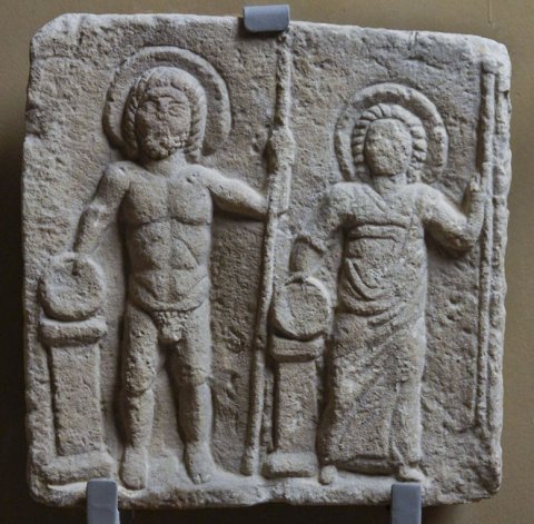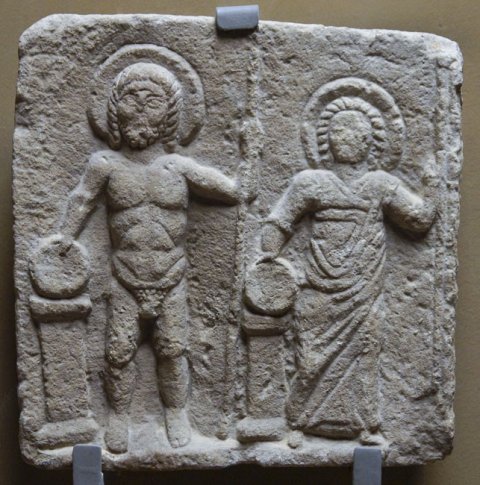 - Mythische Figuren: frontal stehender nackter Jupiter, neben ihm Juno in Chiton und Mantel. Beide halten in der Rechten eine Schale über einem Altar, in der Linken Szepter. Um die Köpfe Nimbus.