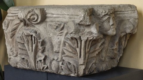 - Korinthisches Pilasterkapitell mit menschlichem Kopf auf der rechten Seite.