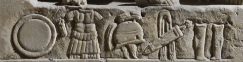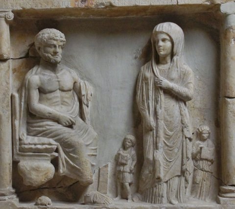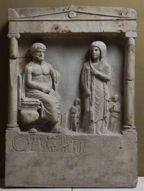 - Bildnische mit Giebel mit Akroteren auf jonischen Säulen. Inschrift auf dem Architrav. Familie: auf einem Sessel sitzender bärtiger Mann im Mantel, vor ihm stehende Frau mit über den Kopf gezogenem Mantel, flankiert von zwei Kindern (Diener ?, links Knabe, rechts Mädchen mit Kasten). Unter dem Relieffeld ungerahmte Fläche mit Reihe von Waffen (Schild, Panzer, Helm, Schwert, Beinschienen).