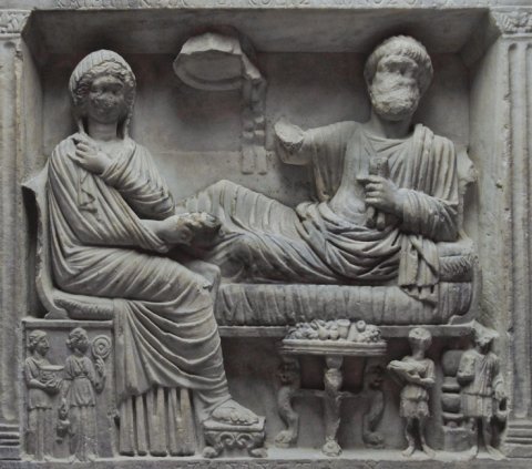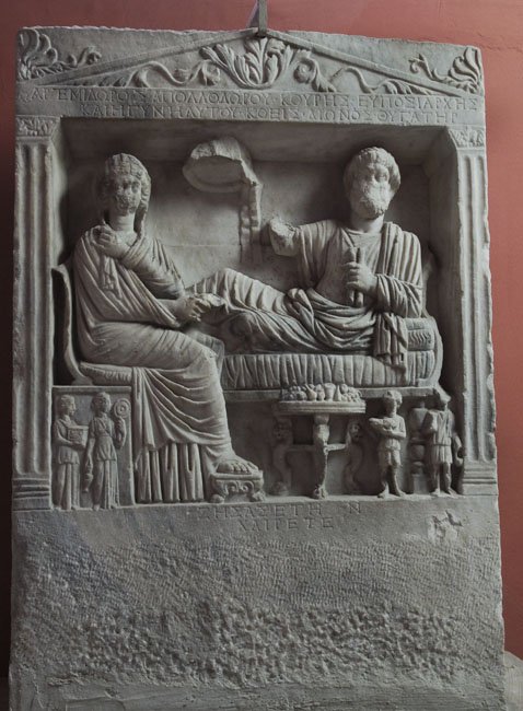 - Totenmahl zwischen kannelierten Pilastern, die einen Giebel mit Ranken und Palmettenakroteren tragen. Bärtiger Mann auf Kline, in der Linken Rolle (volumen). Frau mit über den Kopf gezogenem Mantel auf Sessel mit Fußschemel. Unter dem Sessel zwei kleine Dienerinnen mit Kästchen und Spiegel. vor der Kline Tischchen mit Früchten, rechts davon zwei Diener.