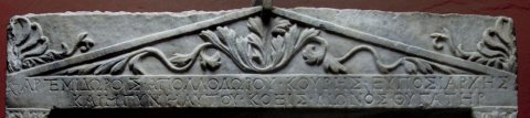 Ἀρτεμίδωρος Ἀπολλοδώρου ∙ κουρὴς ∙ εὐποσιάρχης / καὶ ἡ γυνὴ αὐτοῦ ∙ Κοεις ∙ Δίωνος θυγάτηρ // ∙ ζήσας ∙ ἔτη νʹ / χαίρετε.