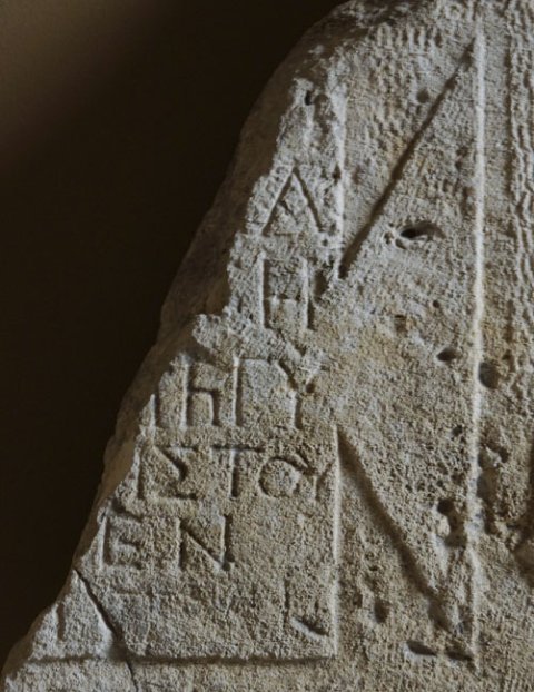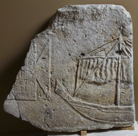 - Inschrift in tabula ansata, daneben Darstellung eines Schiffes mit halb gerefftem Segel