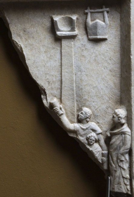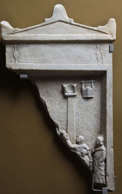 - Stele mit flachem Giebel mit Akroteren. Darunter Frieszone, rechts und links je eine Amphore mit Palmzweig. Im Relieffeld unten die kleinen Figuren einer Frau im Mantel, eines Mädchens und eines Jünglings mit Rolle (volumen) in der erhobenen Rechten. Im Hintergrund Pfeiler mit Sonnenuhr, daneben Kithara. Links stand der Verstorbene.
