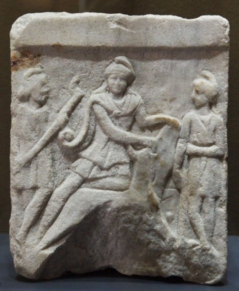 - Mythos (Mithras): Stiertötung (Tauroktonie) mit Cautes und Cautopates