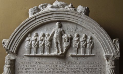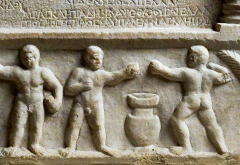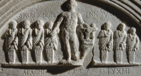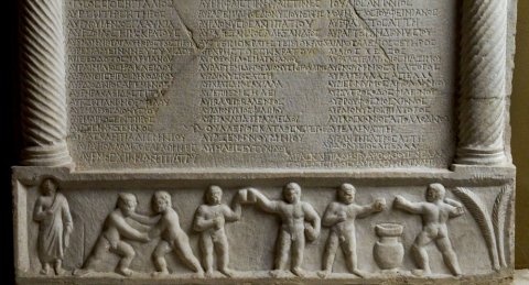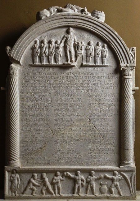 - Profilierter Rundbogen auf Säulen mit Spiralkannelur. Auf dem Bogen gelagerter nackter Hercules (?), im Bogenfeld Apollo, auf Kithara gelehnt, zwischen den Hermen von sieben Phylen. Sockelbild mit drei Paaren von Ringern und Faustkämpfern, links Mann im Mantel, rechts zwei Palmzweige.